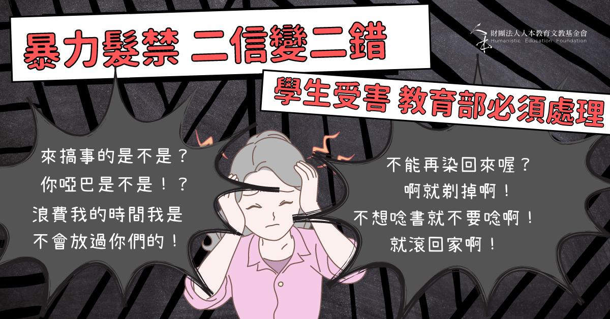 教育部為維護學生身體自主權及人格發展權,明令禁止各級公私立學校實施髮禁,已經過十年。所有教育人員都非常清楚髮禁違反法規。但到今天為止,還有許多學校,尤其是私立學校,不把教育部規定放在眼裡,持續以侵害學生權利。
