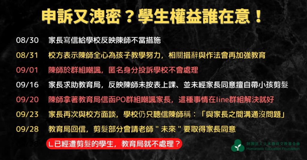 111年9月7日,在上學之前,孩子告訴家長說:「陳老師說我的頭髮該剪了」,而中午家長接孩子放學,竟然就看到自己孩子的頭髮已經被剪短了,陳師擅自帶學生到校內愛心義剪理髮,結束後陳師還送小餅乾給孩子當作補償,家長因此向學校及台中市教育局申訴,卻都只得到:「會再請老師應尊重家長及學生意願並取得同意書」的消極回應,後續十月、十一月陳師仍舊未先調查學生與家長意願,逕自帶學生去義剪,陳師還會嘲諷學生:「你那麼不愛剪頭髮乾脆剪光頭好了」,然而即便學生抗拒、跟陳師說:「我有跟媽媽說我不要剪頭髮!」陳師聽聞卻只回應:「笑死人」!