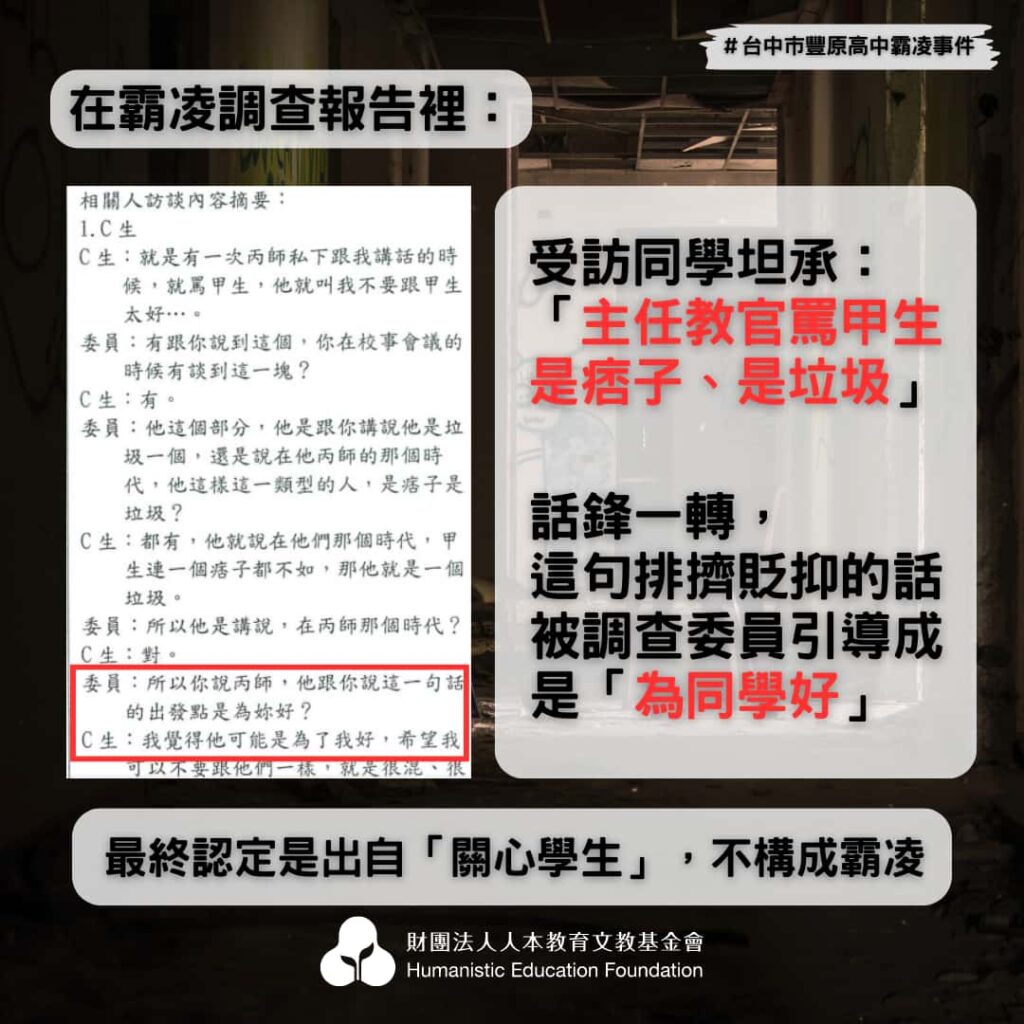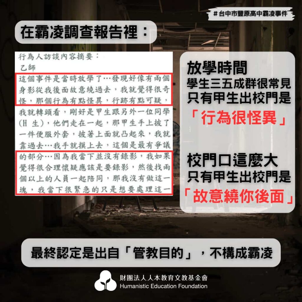 針對臺中市豐原高中學生輕生事件的霸凌調查報告,我們「完全無法接受」。我們呼籲相關調查單位本案千萬不要以為胡亂調查就可以草草結案,本案乃社會關注事件,更應落實調查程序、按部就班,針對是否達到霸凌切實調查、綜合評估,才能真正給社會交代。然而,八月中旬我們與家長收到的霸凌調查報告,不僅內容錯誤百出,連調查方法與結論都讓人瞠目結舌。