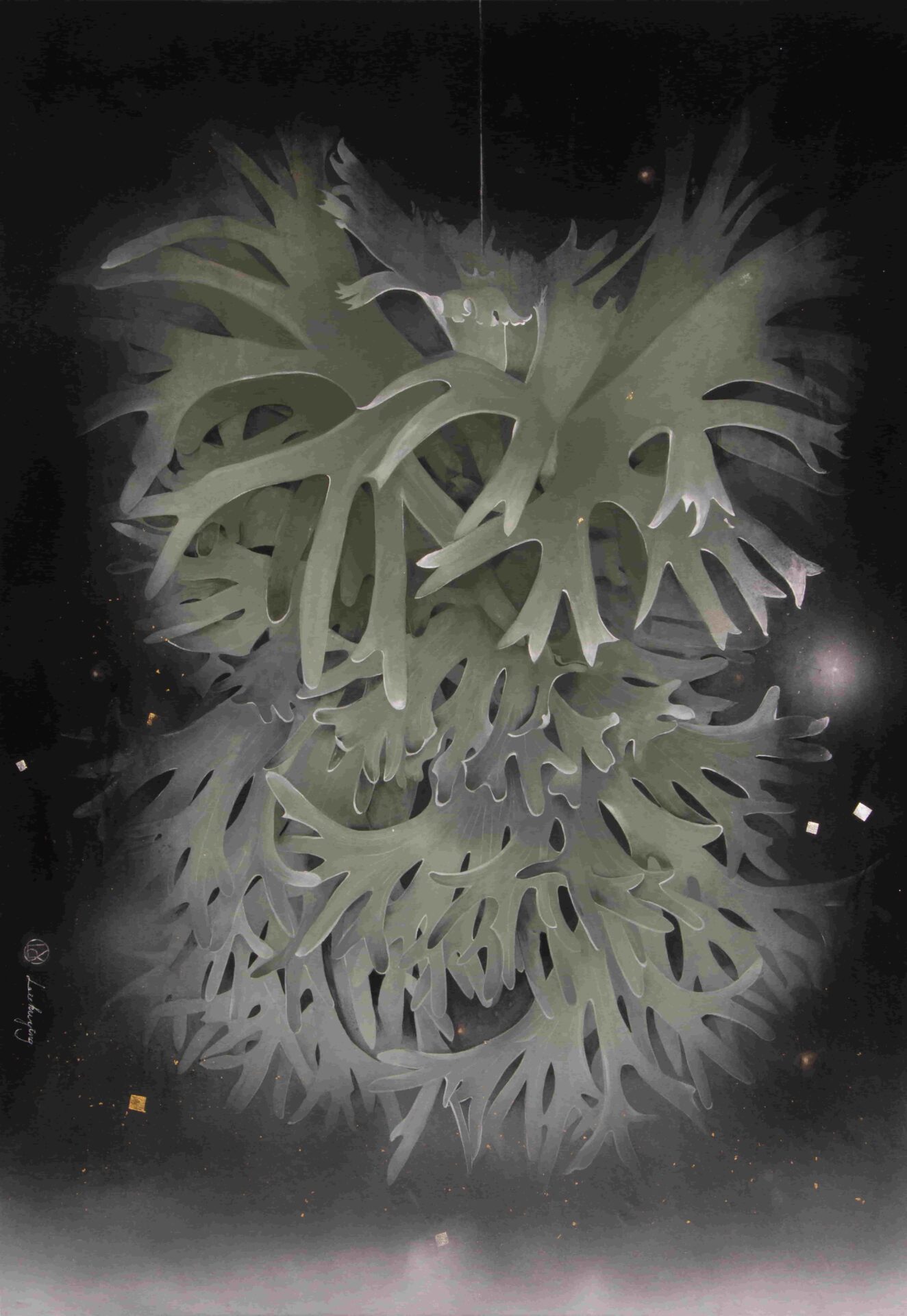 這幅由賴楚穎創作的膠彩畫《幻耀》,將鹿角蕨的質感和星光的朦朧感表現得淋漓盡致。膠彩畫的層次感和溫潤質感,讓作品散發出一種古典美感。