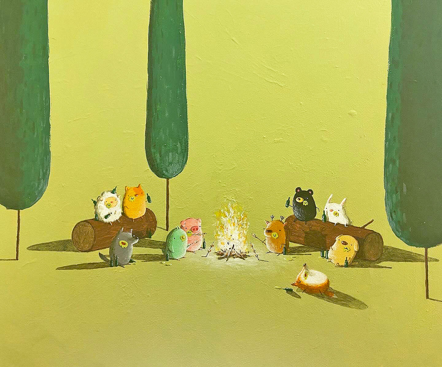 在靜謐的綠森林裡,小怪獸們圍著營火,