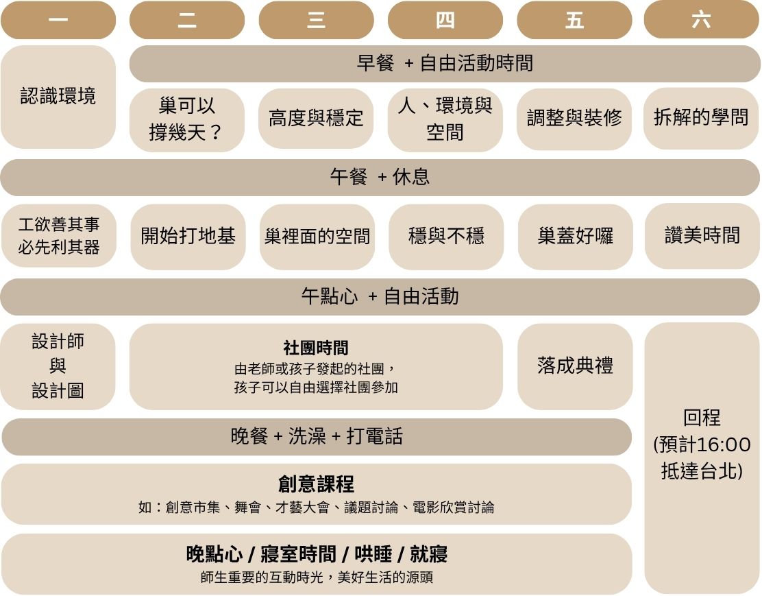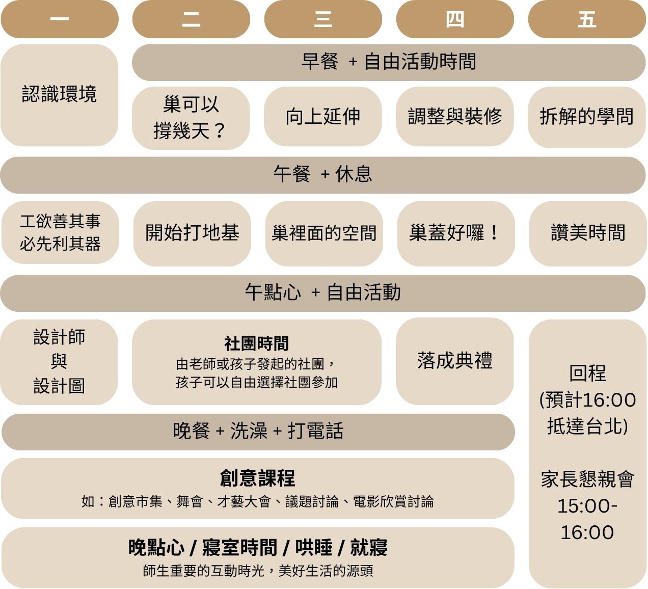 從發想設計圖、認識巢的結構、安全的工具使用到實際蓋巢,我們將有建築系專業助教協助。