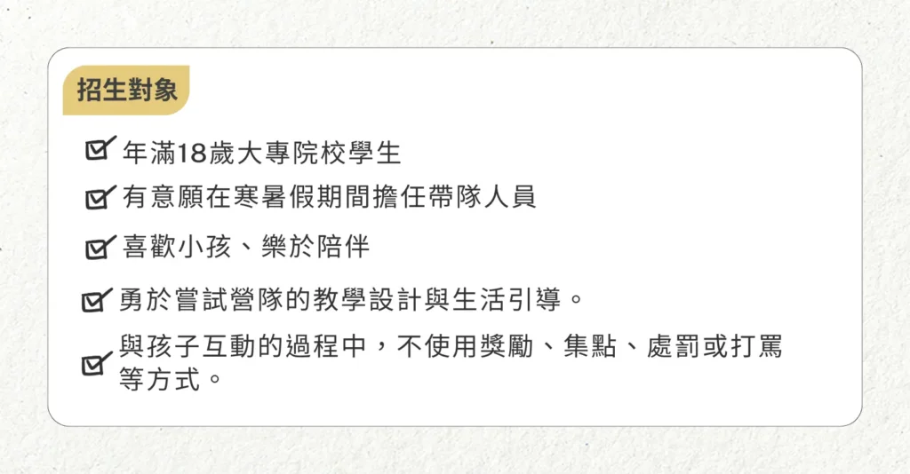 我們希望活動員是對世界充滿好奇、對教學懷抱熱忱,也更願意理解孩子的人。所以是否有修過教育學程、是不是教育相關科系,並不是我們的第一要件,這也因此,我們希望透過課程,讓更多的人都能成為一個更好的大人,有更好的眼光與方式看待、對待遇到的孩子。