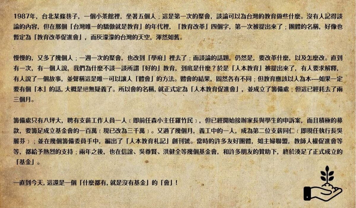 十二年來(1987-2001),人本教育基金會有著豐富的歷史﹔但重要的不是過去,而是每一個即將到來的明天。