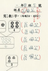 例如,有一份考卷上,被老師罰寫五次自己的名字…