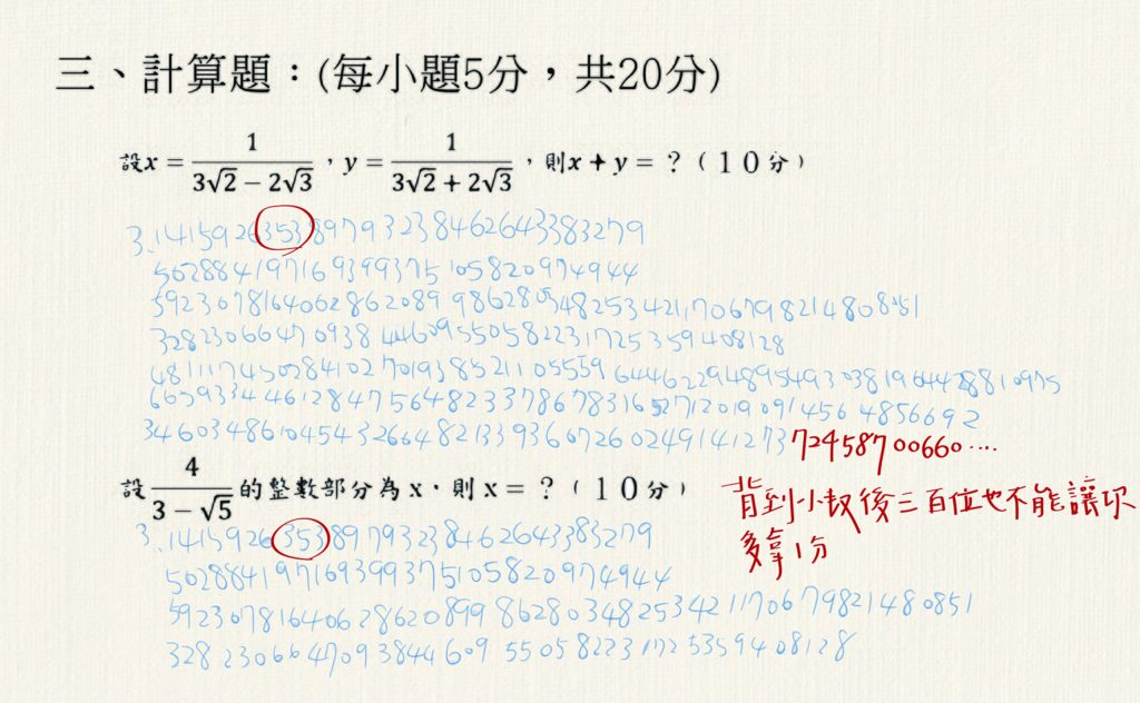 顯示了老師的態度,把自己的高度拉了下來,拉到和學生「角力」的低度。合理的評語可以是:你能背那麼多位還滿有心的,可惜和這題無關不能給分。