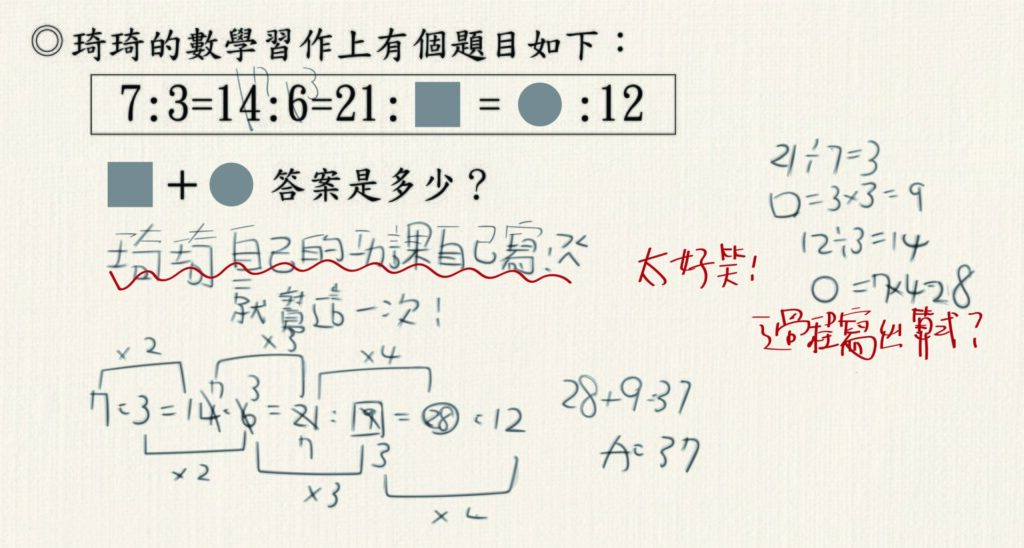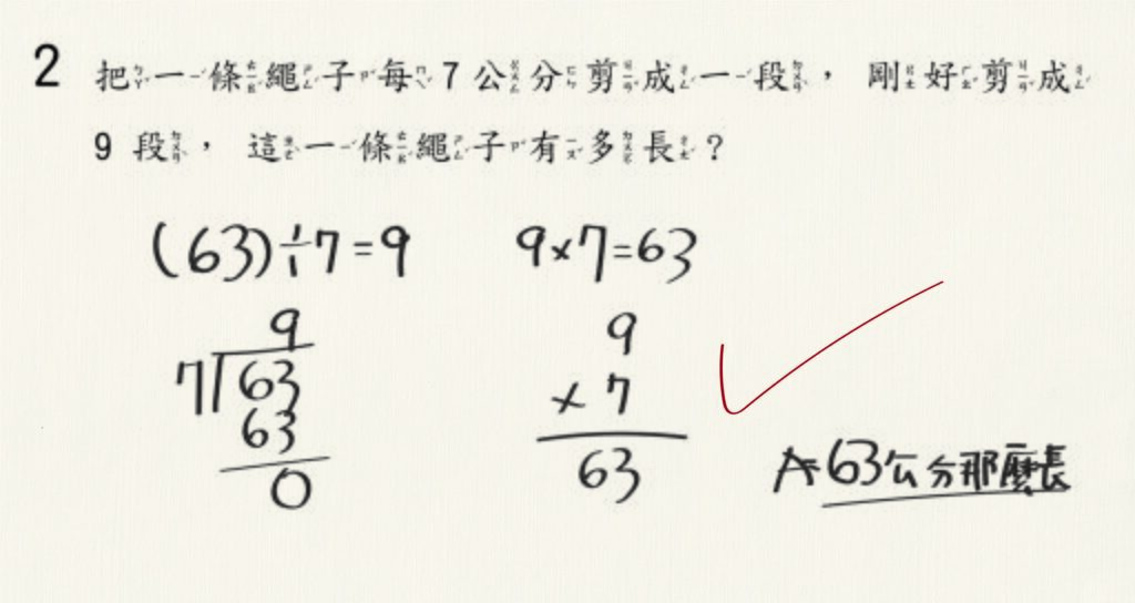把每一步的過程都表達清楚,展現了非常高的數學能力;老師卻要他寫那些不知何所指的所謂「算式」(在右方),非常令人遺憾——這樣公開展示專業能力的不足,已經不是態度與高度的問題了。