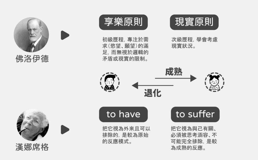 面對身體病痛或其他不可慾的事物,精神分析學者漢娜席格(Hanna Segal)提出了兩種態度:”to have” vs. “to suffer”。to have意指「把它視為外來且可以排除的」,與另一位精神分析學家梅蘭妮·克萊恩(Melanie Klein)提出的「paranoid-schizoid position」(註二)有關,是較為原始的反應模式;to suffer意指「把它視為與己有關、必須被思考涵容、不可能完全排除」,與克萊恩提出的「depressive position」有關,對事物有較完整的認識,是較為成熟的反應。