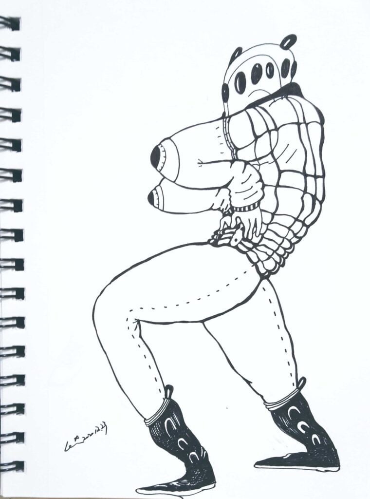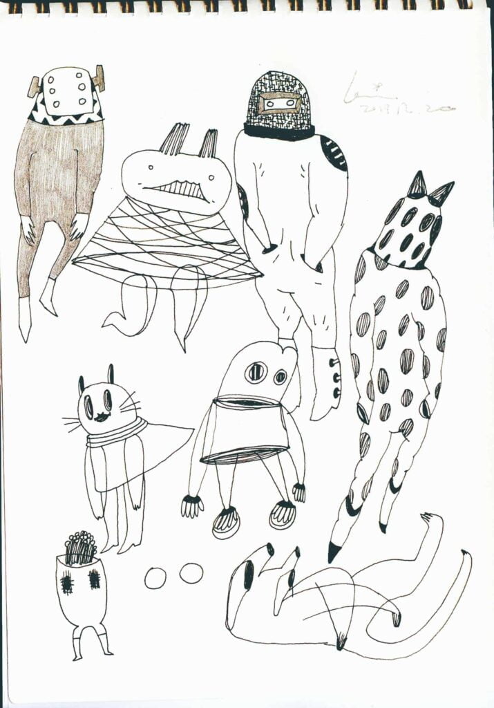 他翻看著自己的筆記指著某些角色,興高采烈的說:「看!這幾個可以做成三米高的作品,也許用線條輪廓就好,吊在窗戶牆角⋯」他指著屋前的水池說這裏那裏可以放水系怪物,哪面牆又怎樣懸掛作品云云,說得摩拳擦掌眼底發光。