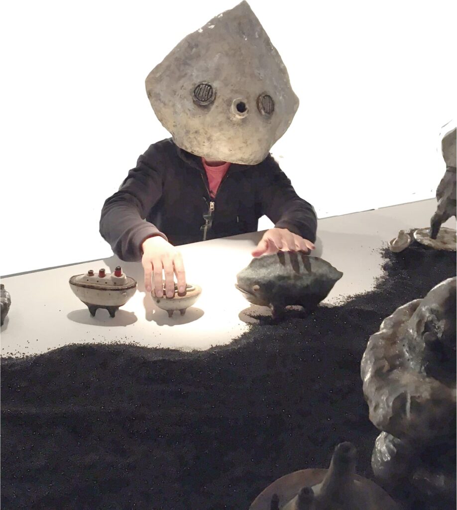 這種旁觀者視角或許是作品魅力的源頭!阿咧的作品無法歸類界定是玩具公仔還是藝術品,是怪獸還是機器人或外星生物,好笑好玩又怪裡怪氣,既有大人身形又是怪物外表,同時具有兒童內在,會讓人心底冒出:「這!到底是啥啦?」但眼光捨不得離開。太常被問到他豐沛天馬行空的靈感從何而來?阿咧便做了一個「靈感產生器」,他淘氣的說:「我的靈感都是從這裡來的!」