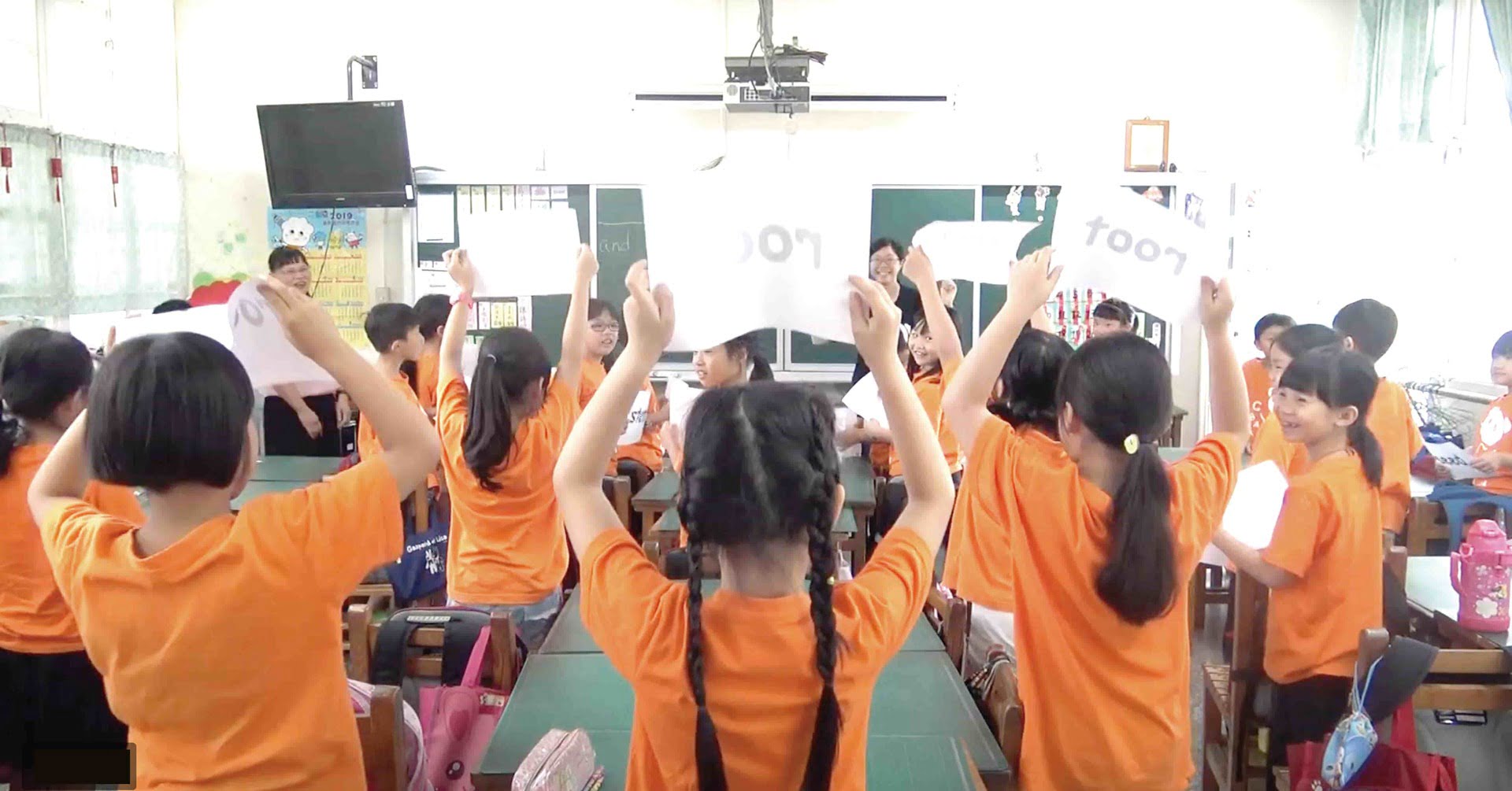 舉一節健康課來看(註4),課程主題是Seasonal Food。老師先問小孩喜歡吃的⽔果,講半天全班只湊出四種(因為只能用英語回答);接著再問喜歡的蔬菜,這就更難講了,在potatoes後好不容易出現onions(那小孩真喜歡洋蔥?),再等一陣子才又有學⽣說出mushroom,但全班都聽不懂,老師就畫圖讓小孩猜出是香菇,這時有人心領神會,模仿外國人的聲調說「享~故」──全班哈哈大笑,氣氛才頓時活絡起來。