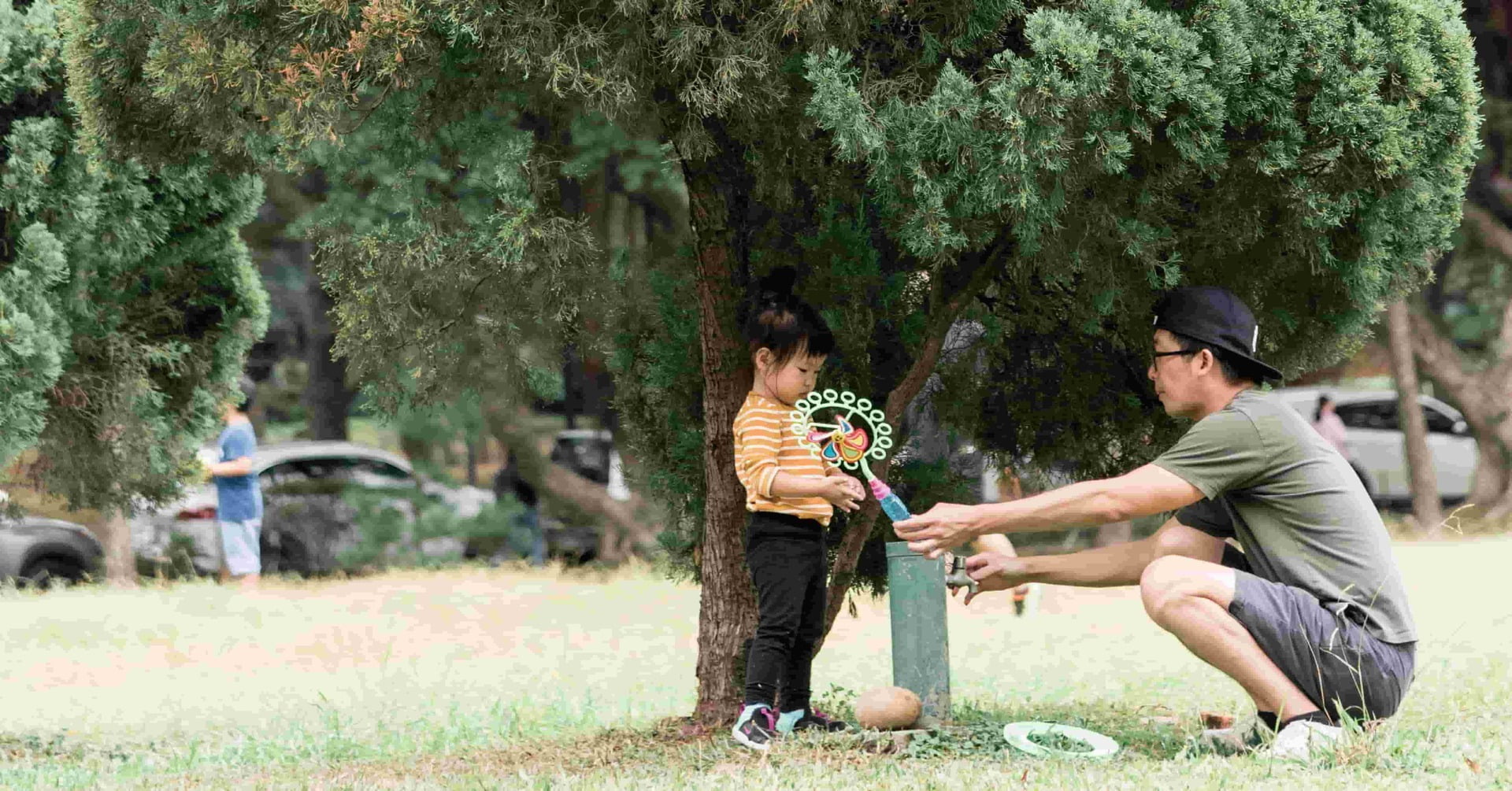 水圳旁、喬木下,今年的430非常不一樣!4月30日國際不打小孩日當天,竹北市東興圳綠園道紮起了一座座百合色的帳篷,襯著綠地十分好看。微風中飛揚著青剛櫟的細小花瓣,耳邊輕快童聲傳唱著: