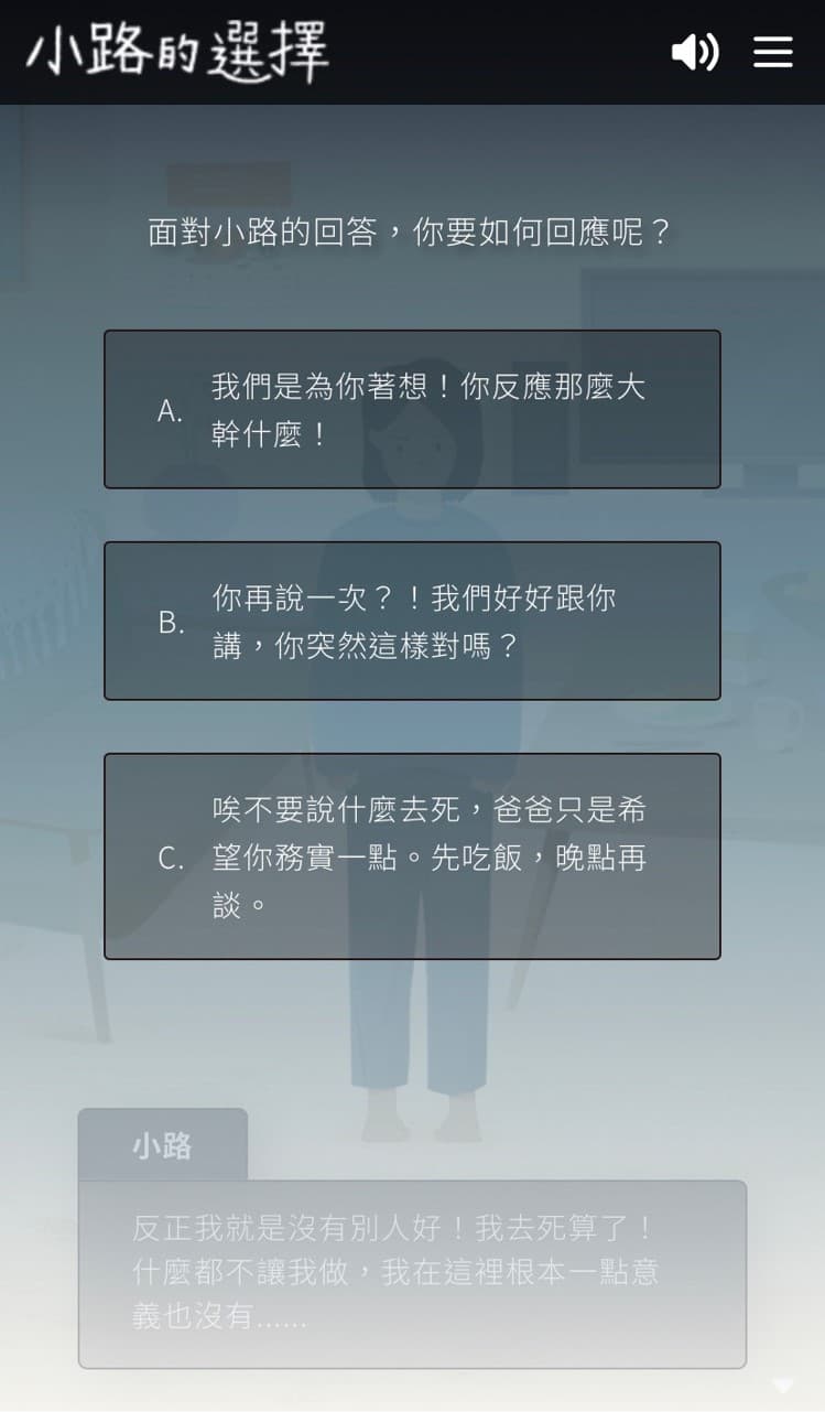 我們邀到三位媽媽,分享操作網站後的心得。原以為〈小路的選擇〉會讓媽媽們覺得被控訴,畢竟選項選錯了,小路會選擇自殺。但A媽媽的眼淚,破除了我的假設。「感覺小路很孤獨」、「會心疼會想接住她」、「會擔心她這樣會不會痛」,不只A媽媽,媽媽們對小路的擔心與心疼,把我從小路的世界拉回到現實。