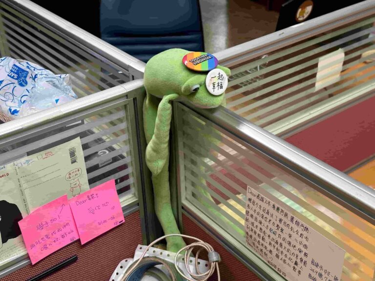 打開辦公室的門,左前方的區塊鋪上木質地板與木質長椅,但椅子上擺了…兩隻青蛙擺飾?我眼角隱隱約約瞥到牆上有一幅綠色點點的布。一旁的副主任素慧開心地對我招招手:「你看你看。」嗯,布上的綠色點點全部都是卡通圖案的青蛙。然後往辦公桌一看,一隻青蛙布偶俯趴在辦公桌的分隔牆上。再往裡處走,主任桌上還有兩隻青蛙擺飾。