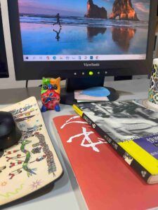 從回憶裡回神後,他環視一下現今的同事似乎有了寬慰。但會計工作無論何時都繁忙,春玉的桌面也合情合理的被各種報表與資料淹沒,在資料海嘯中,我看見春玉的電腦螢幕下方探出一隻白色的絨毛狗狗玩偶。