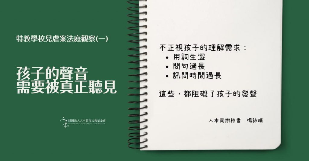 不只是芯芯,事實上一個多月前芯芯的同學出庭作證時,情況也差不多,例如檢察官問:「芯芯有沒有聽老師的話,是一個聽老師話的好學生嗎?」當時我滿頭問號:只有聽話的才是好學生嗎?如果偶爾反抗呢?而且都不管老師的要求合不合理?這提問,也太難!而難的還不只如此,檢察官有時問句太長,而且一個問句還包含多個提問:「老師會不會打芯芯的手或臉?」「你有沒有看過A老師或B老師叫芯芯在吃午餐的時間或睡午覺的時間寫功課?」對一般的孩子來說,聽到這樣的問題,通常只會回應後半段,如果是特教學生,可能就閉口不答,或是說:「我不知道」。